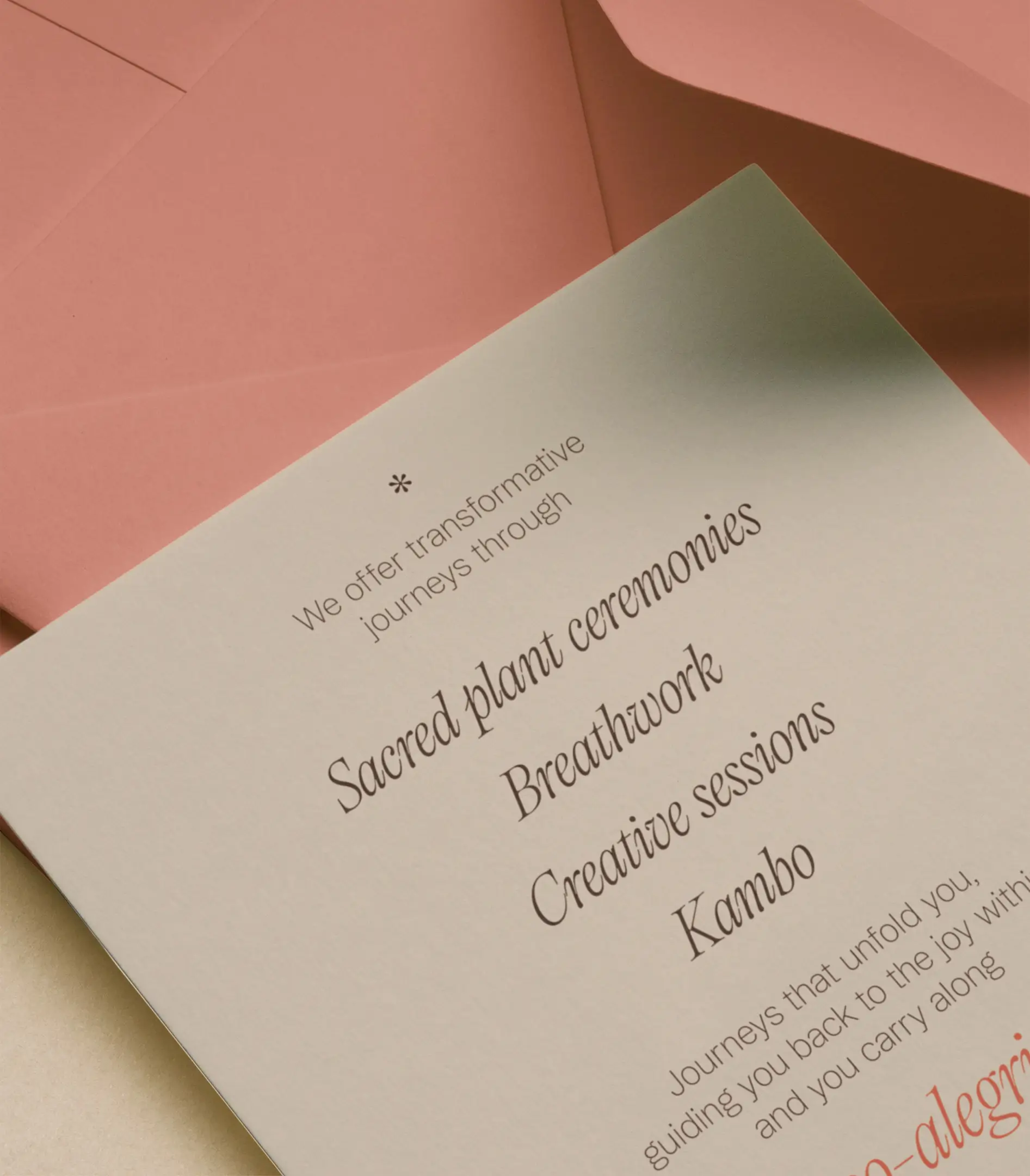Surpassing the usual style standard of commercial businesses in spirituality, the branding had to actually be careful not to exaggerate its influence any further. The goal was to successfully launch, and to attract a curious audience all the way to the jungle of Cost Rica. By truly capturing the unique feeling of spiritual growth, we were able to convey So Alegria’s value without having to oversell it.